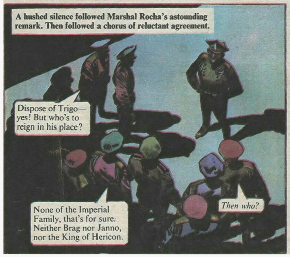 These panels are the opening of Episode 8, Revolution in Zabriz. Note that here Janno is named as second in line of succession to the throne. Note also that Trigo’s coronation is incidental to the rest of the story.