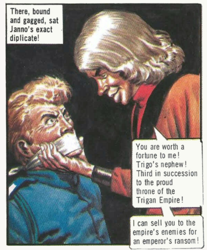 To cut a very long story short, Janno et al discover that Argo is controlled by Thringa, and plot to regain control of the empire. Salvia meets Argo’s twin brothers, Nikko and Rilla, in the market. The conspirators succeed in replacing Argo with Rilla, but during a speech, Rilla is killed, inciting a revolt against the regime. Argo is killed in an air battle. The surviving triplet Nikko becomes emperor-in-waiting. And then . . . Trigo returns from the dead.