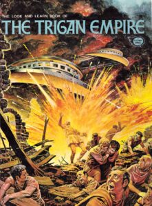 Quite a lot happens after that. Trigo’s chosen heir, named Argo, falls under the thrall of an evil alien being called Thringa. He causes Trigo’s atmosphere craft to crash in the jungle of Daveli. Argo, the pilot, ejects to safety. Subsequently, Argo crowns himself Emperor of Trigan.