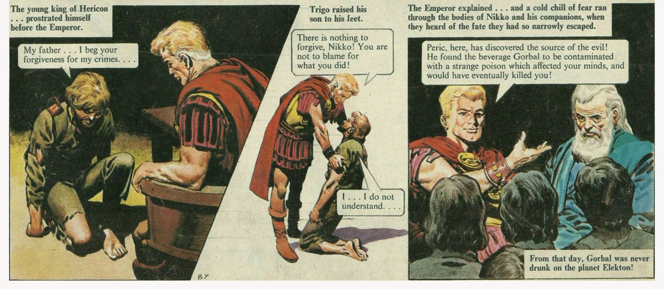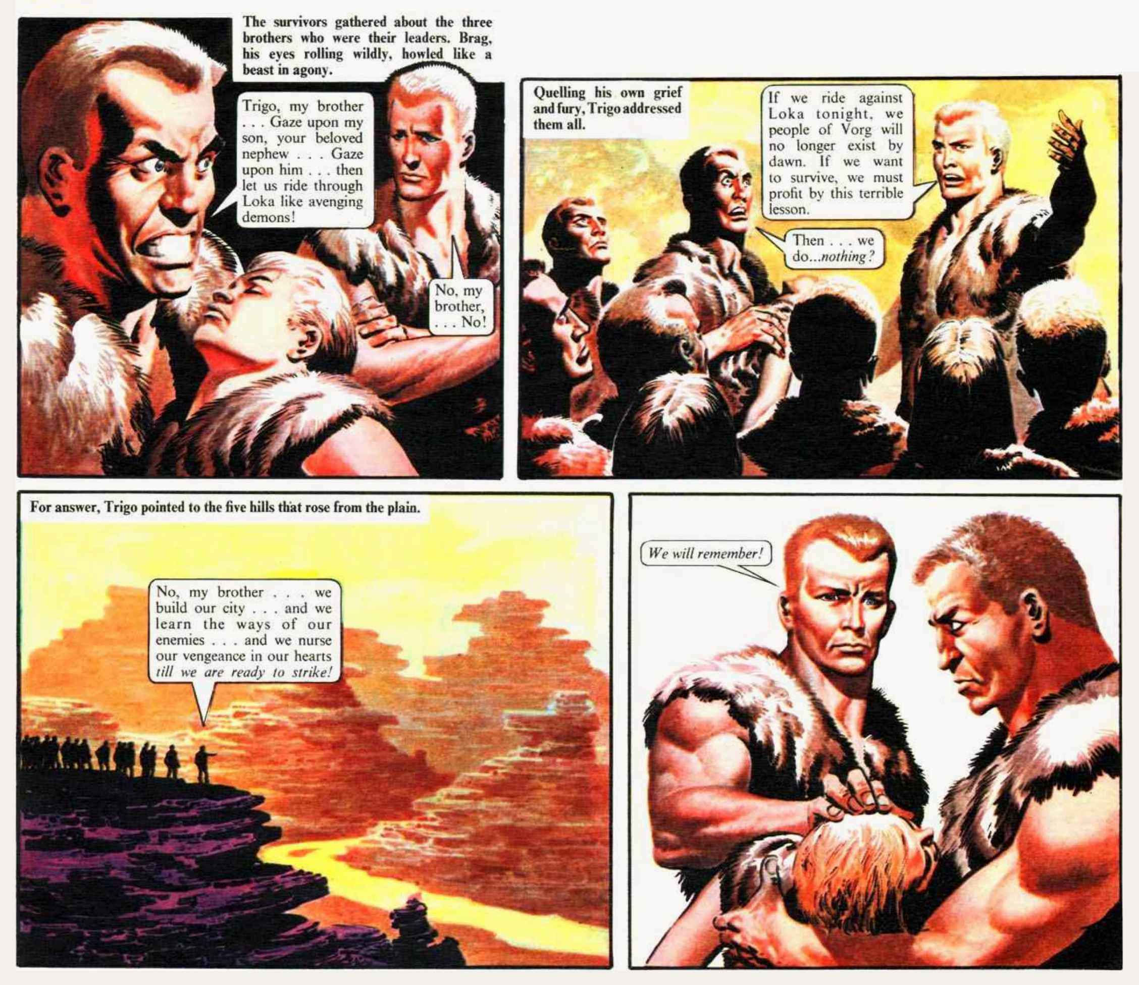 It’s one of the most barbaric incidents in the annals of the Trigan Empire. I’m a bit surprised that Butterworth got away with it. And not a bit surprised that when Hawk reprinted Episode 14 as A Tale of Sons and Heirs in the 1989 compilation Tales from the Trigan Empire they chose to leave out the start of the tale entirely.