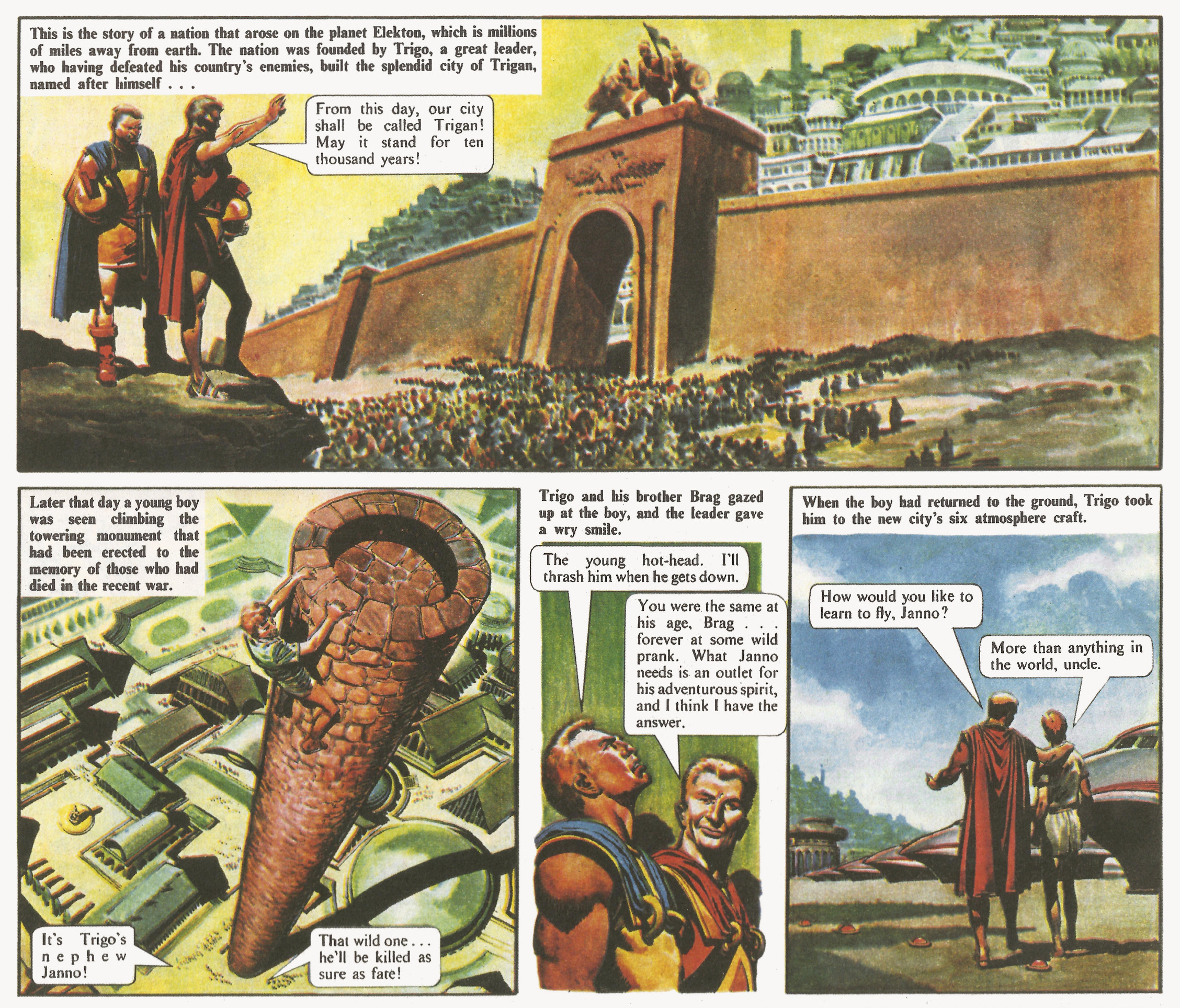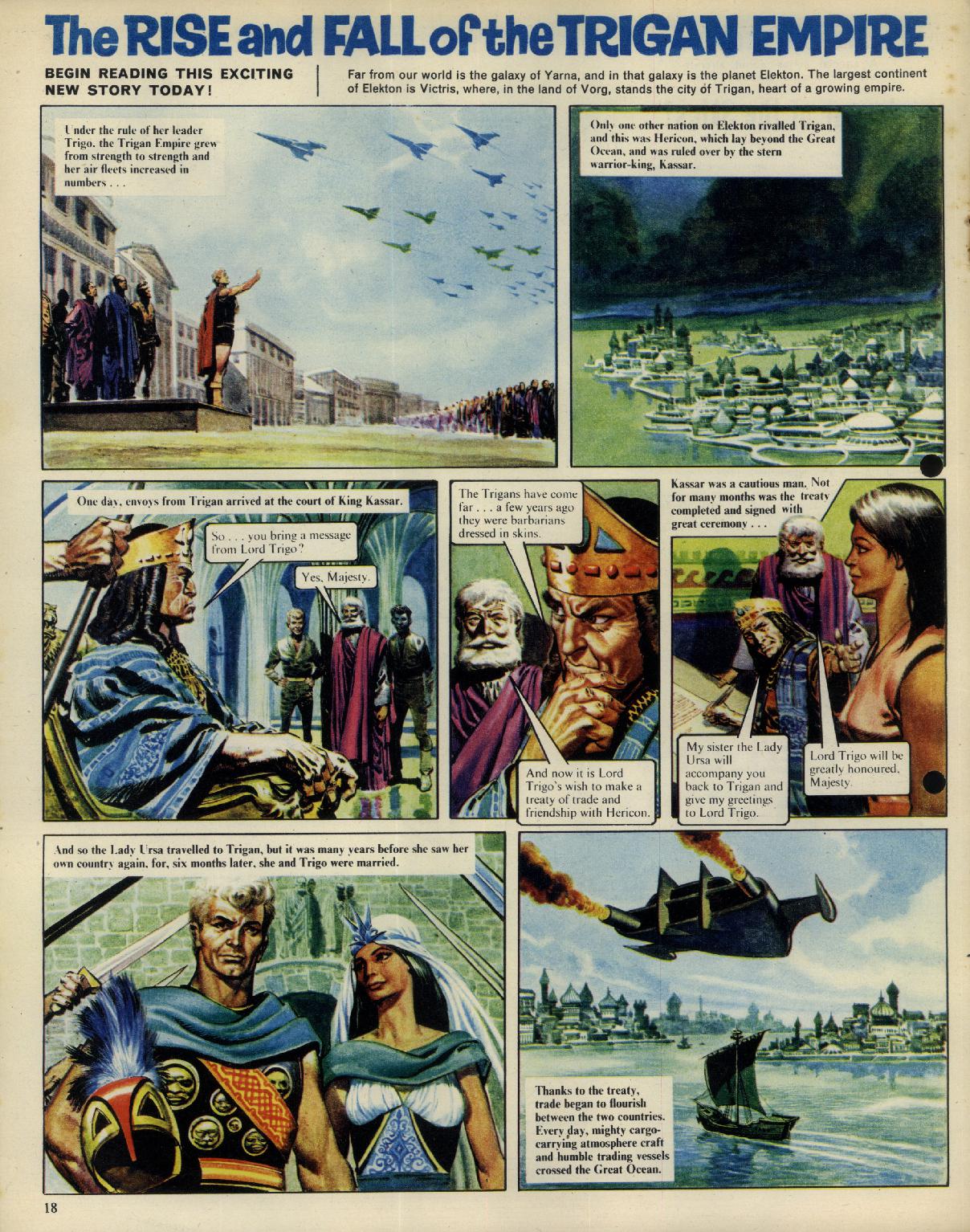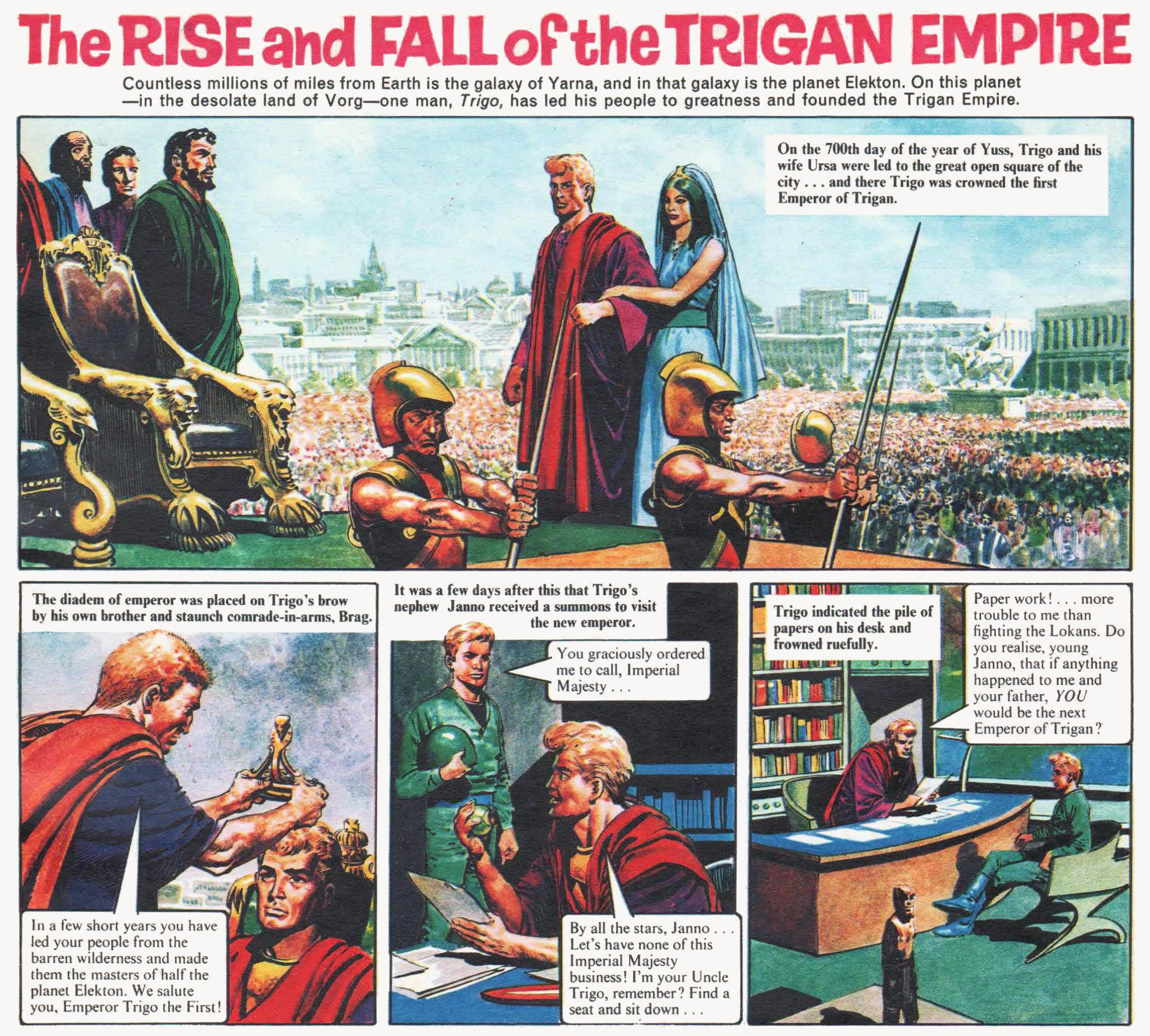 The planet Elekton lies in the galaxy of Yarna, and the greatest power on Elekton is the Trigan Empire, ruled over by its founder, the Emperor Trigo.