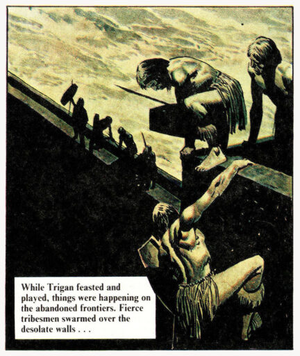 It seems clear that, at its conception, The Rise and Fall of the Trigan Empire was intended to be similarly epic—recounting the rise and fall of successive Trigan emperors—charting the course of a veritable dynasty. But then—as noted above by the editor of the Don Lawrence Collection—it happened! Mike Butterworth moved away from his original influences. The Trigan Empire peaked—and plateaued.