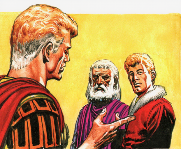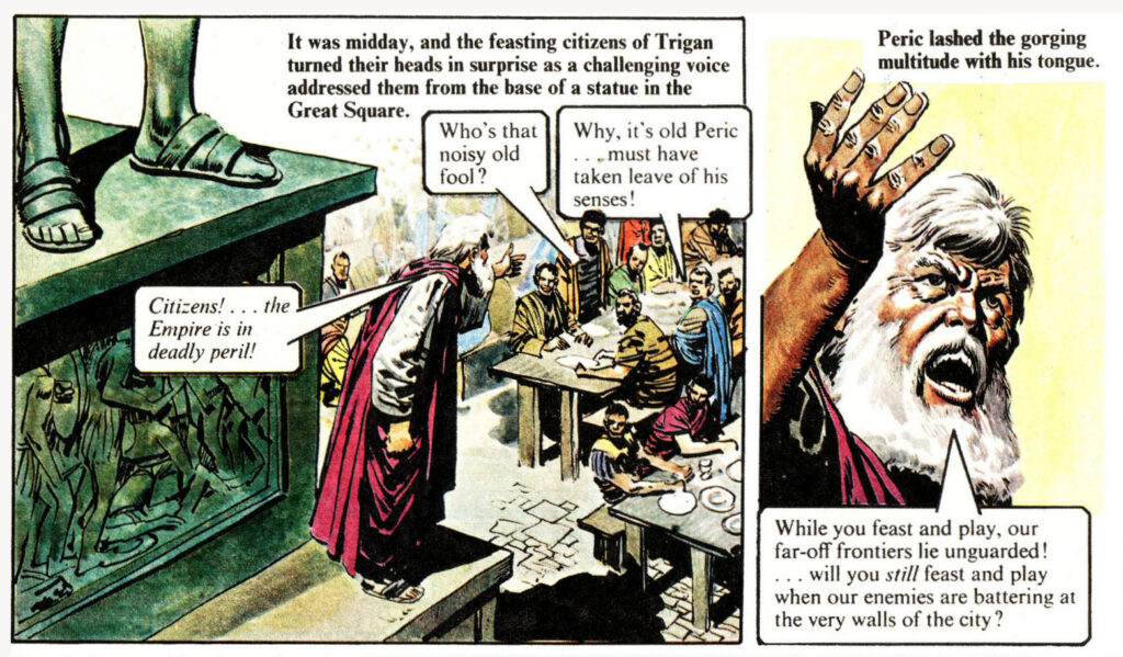 Certainly, the Trigan Empire was originally inspired by the Roman Empire, and by ancient Rome and classical antiquity more generally. Take, for example, the names of the three main characters of the series. The name Trigo (and the Trigan Empire) are more than likely derived from that of the Roman Emperor Trajan. Janno is probably named after the Roman god Janus. And Peric almost certainly is named after the preeminent Greek statesman Pericles.