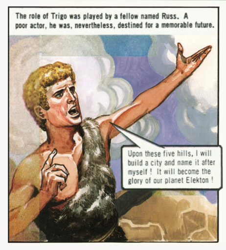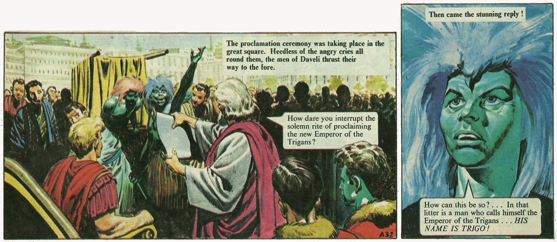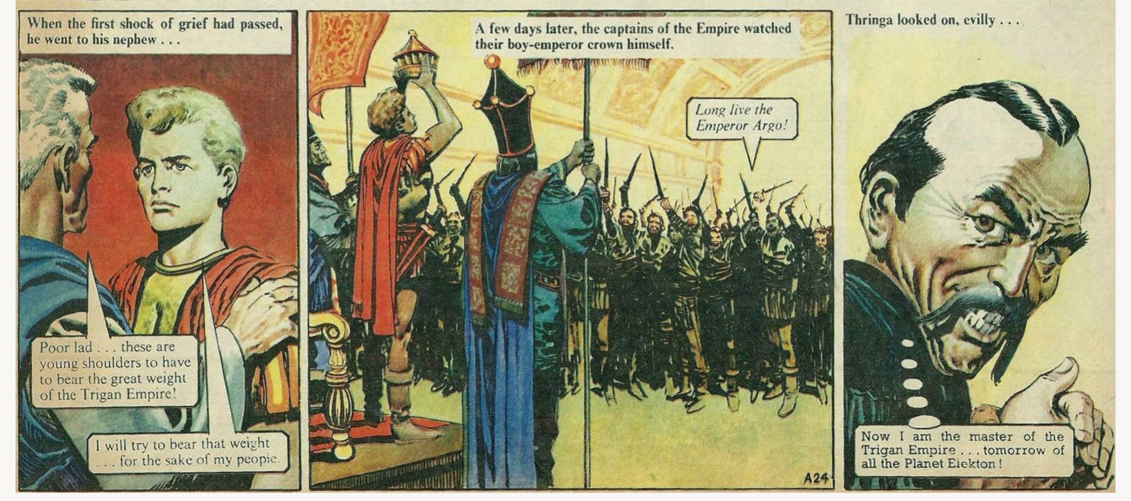 Quite a lot happens after that. Trigo’s chosen heir, named Argo, falls under the thrall of an evil alien being called Thringa. He causes Trigo’s atmosphere craft to crash in the jungle of Daveli. Argo, the pilot, ejects to safety. Subsequently, Argo crowns himself Emperor of Trigan.